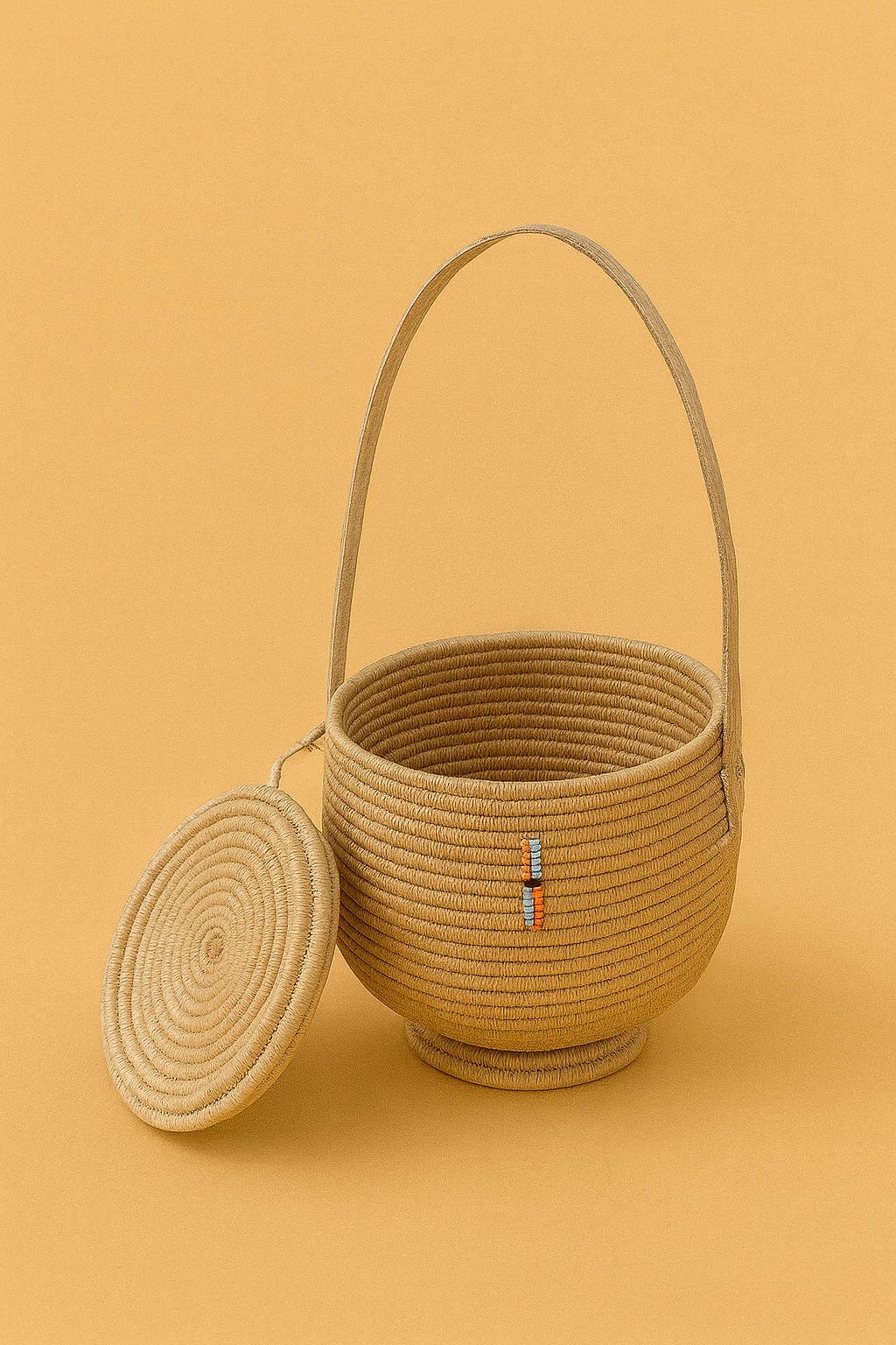 This Pokot Handwoven Storage Basket is crafted by women artisans in West Pokot, Kenya, using natural sisal and wild grasses, coiled and stitched entirely by hand. Once essential in every household for storing grains and flour, these baskets protected families through dry seasons and carried bead accents symbolizing blessings like rain, peace, and harvest. Beyond their utility, they are powerful symbols of sustainability, care, and cultural identity. Today, they bring both practical storage and authentic décor to modern homes. Every purchase supports women’s cooperatives, funds education, and sustains traditional weaving practices.